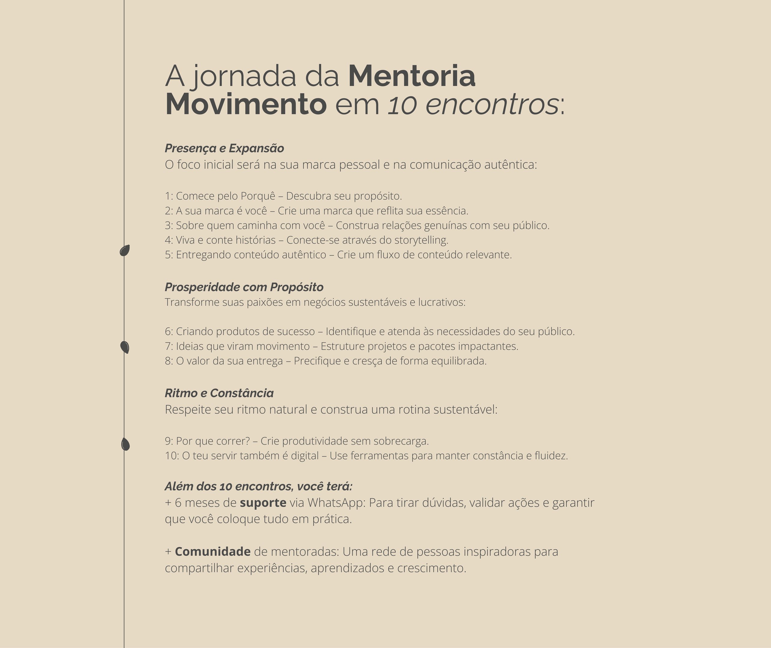 Um programa completo e personalizado - 1:1, que te ajuda a alinhar suas paixões, fortalecer sua marca e prosperar de forma autêntica. Ao longo de 10 encontros e 6 meses de suporte, você terá acesso a ferramentas práticas, reflexões profundas e estratégias para: